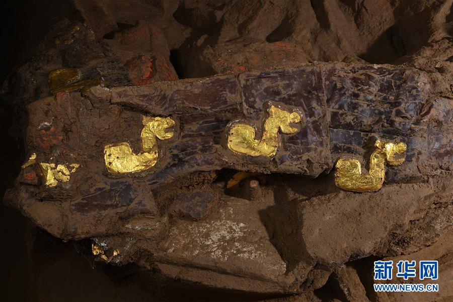 這是在位于河北行唐的考古實驗室內(nèi)拍攝的局部車廂上鑲嵌有成組對稱的貼有金箔飾片的金屬質獸型牌飾(12月4日攝)。新華社記者 李賀 攝