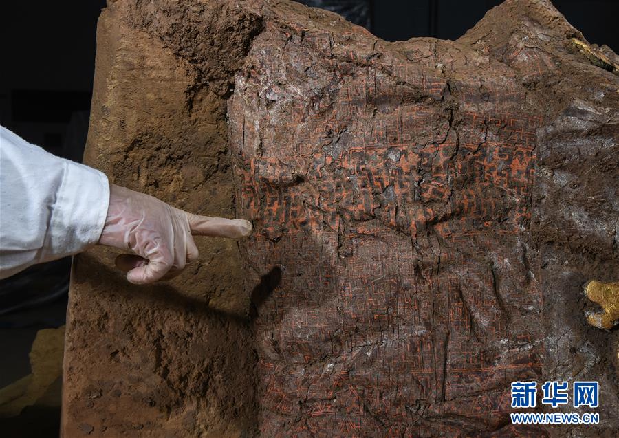 這是在位于河北行唐的考古實驗室內(nèi)拍攝的裝飾有繁復髤漆彩繪圖案的車廂遺存(12月4日攝)。新華社記者 李賀 攝