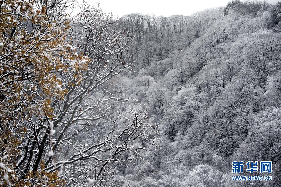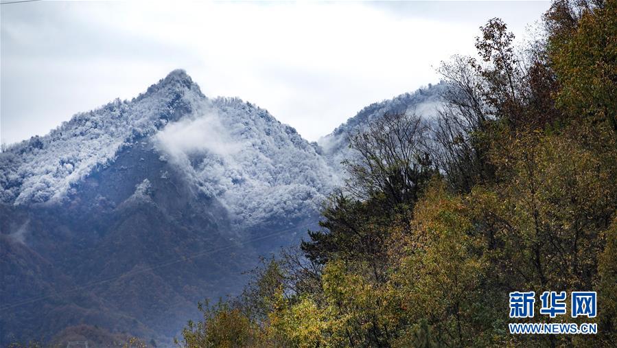 鬼谷嶺國家森林公園山頂白雪覆蓋,半山卻是一派秋色(11月8日拍攝)。 新華社記者陶明攝