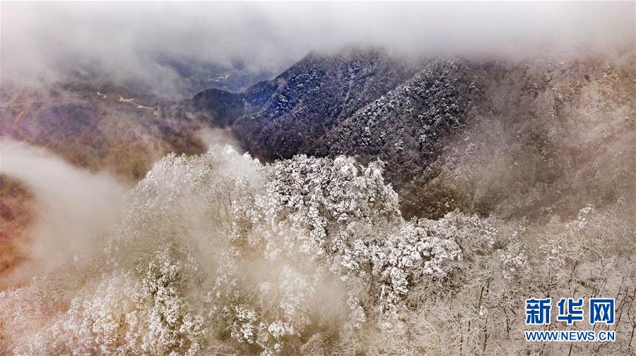 11月17日無人機拍攝的華山蒼龍嶺。 當日凌晨的一場大雪將西岳華山變成白雪皚皚的世界,白雪與蒼翠的華山奇松、靈動的云海交相輝映,如夢如幻;滿山遍野玉樹瓊花,樹枝上通體的霧凇晶瑩剔透,繪就冬日畫境,美不勝收,游人如置身人間仙境。 新華社記者陶明攝