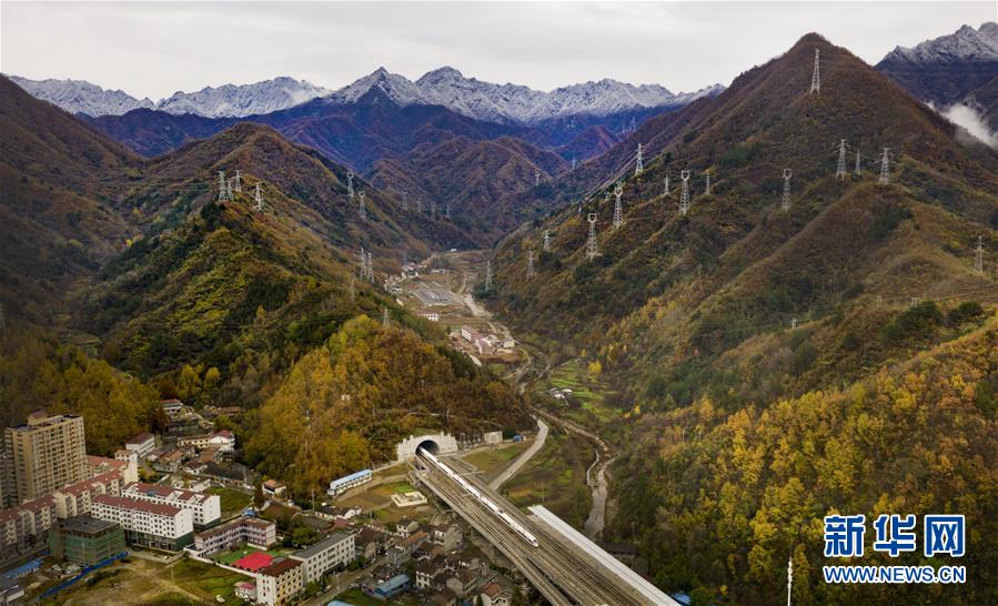 11月5日,一列動車從陜西省漢中市佛坪站駛過(無人機拍攝)。 新華社記者陶明攝