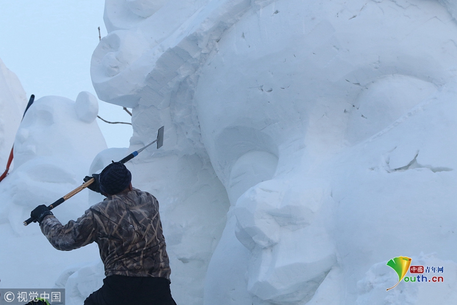 2018年12月13日,黑龍江省哈爾濱市,國內(nèi)最大的雪雕盛會太陽島雪博會正在緊鑼密鼓建設中,部分雪雕雛形已現(xiàn),雪雕師正在精雕細刻打磨中。