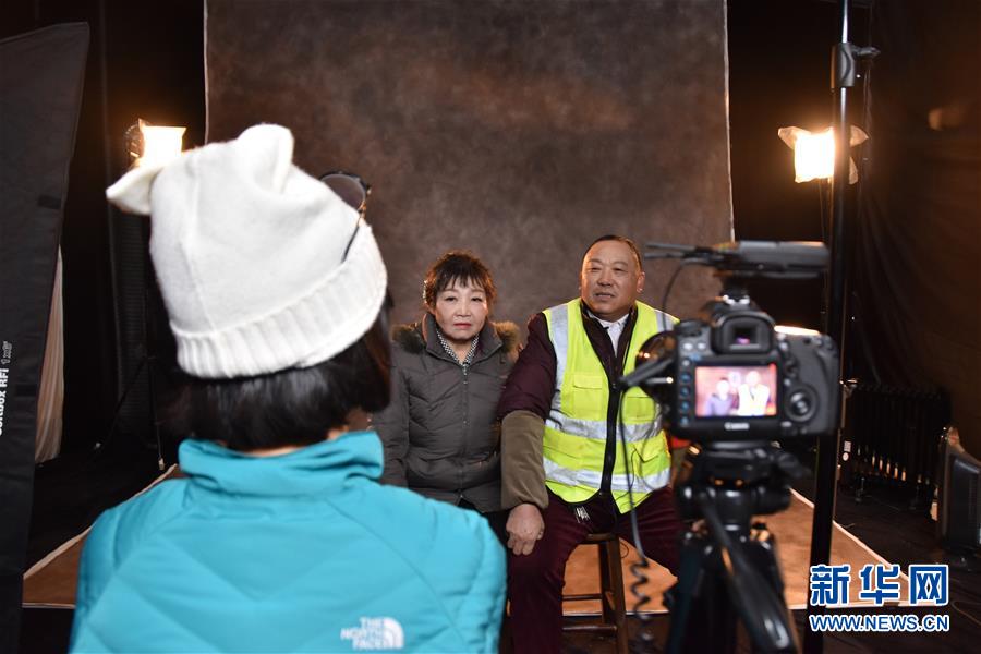 攝影師羅嫻在拍攝前和農(nóng)民工夫妻聊天(12月10日攝)。 新華社記者 白田田 攝
