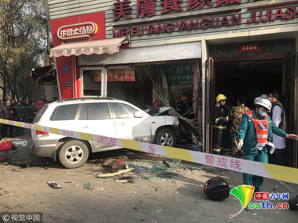 2018年12月14日上午10時左右,在鄭州市中原區(qū)淮河路與工人路交叉口發(fā)生一起交通事故。一輛白色SUV轎車在撞上一輛電動自行車后沖入沿街一包子店,事故造成1人死亡,8人受傷。據(jù)鄭州市交巡警二大隊通報,目前,59歲的肇事司機陳某已被警方控制,傷者送醫(yī)救治,事故正在進一步調(diào)查。圖為交警在事發(fā)地點處理事故。