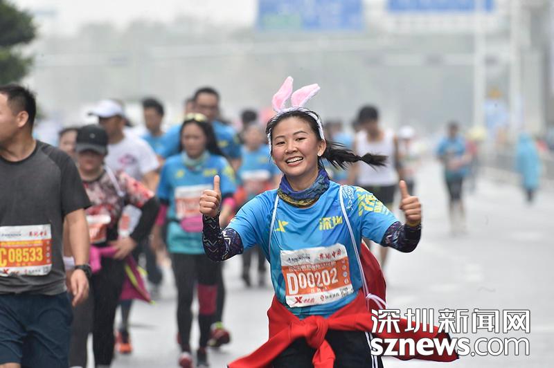 2018年12月16日,深圳國(guó)際馬拉松位于后海的折返點(diǎn),即將抵達(dá)終點(diǎn),選手對(duì)著鏡頭豎起大拇指。
