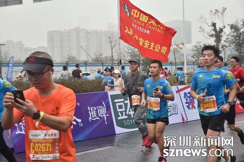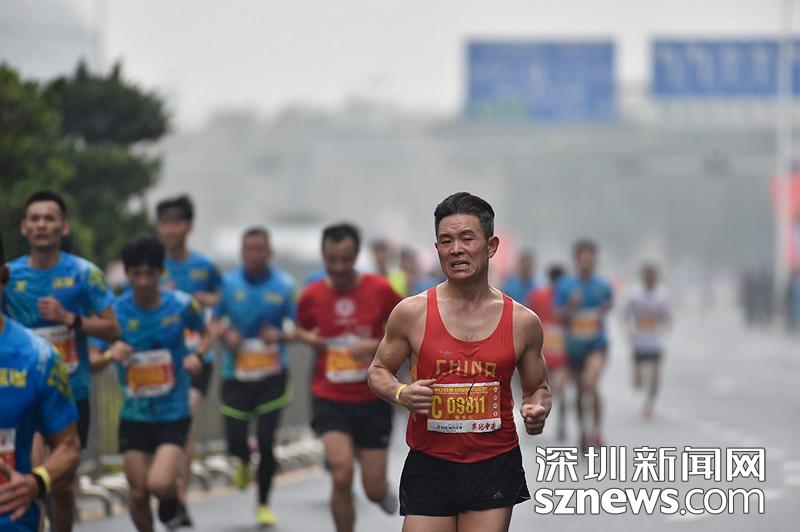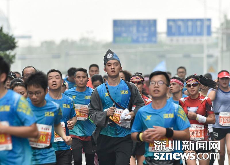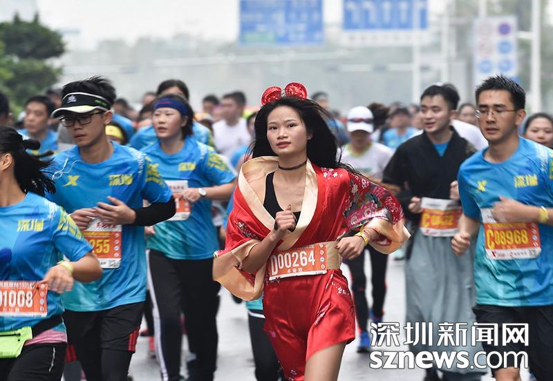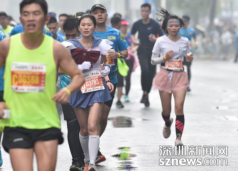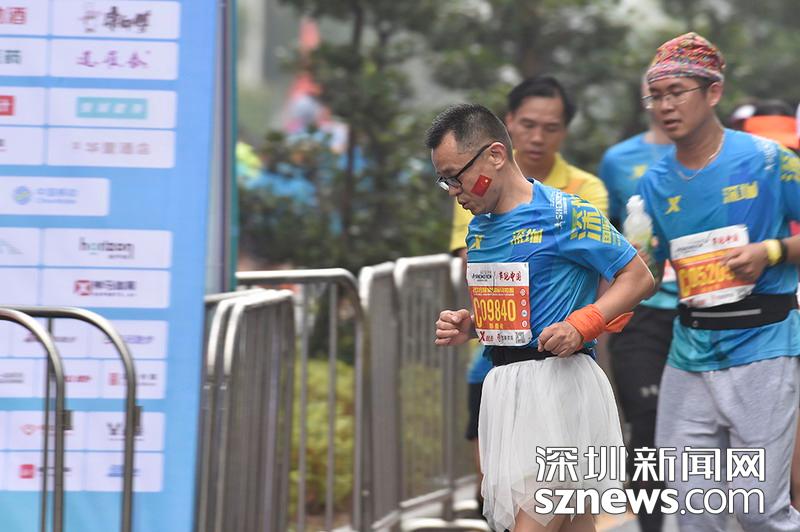 2018年12月16日,深圳國(guó)際馬拉松位于后海的折返點(diǎn),三名選手正在向終點(diǎn)沖刺,跟其他選手不同,其中兩位選手選擇了自己搭配服裝參賽。