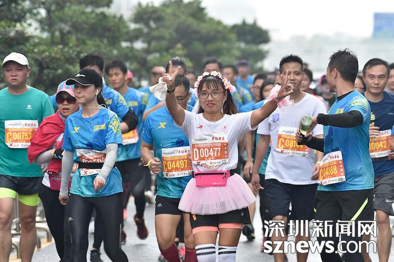 2018年12月16日,深圳國(guó)際馬拉松位于后海的折返點(diǎn),即將抵達(dá)終點(diǎn),一名選手?jǐn)[出勝利姿勢(shì)。