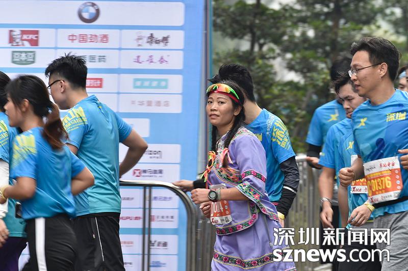 2018年12月16日,深圳國(guó)際馬拉松位于后海的折返點(diǎn),一名身著民族傳統(tǒng)服裝的選手正在向終點(diǎn)沖刺。