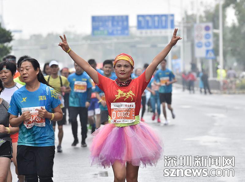 2018年12月16日,深圳國(guó)際馬拉松位于后海的折返點(diǎn),即將抵達(dá)終點(diǎn),一名選手歡呼雀躍。