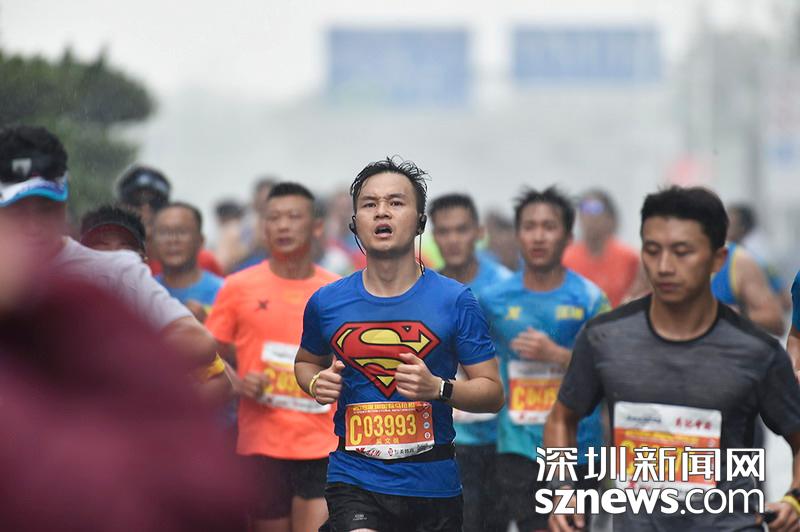 2018年12月16日,深圳國(guó)際馬拉松位于后海的折返點(diǎn),一名身著超人標(biāo)志短袖選手正在向終點(diǎn)沖刺。
