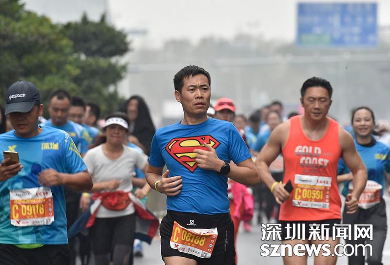 2018年12月16日,深圳國(guó)際馬拉松位于后海的折返點(diǎn),一名身著超人標(biāo)志短袖選手正在向終點(diǎn)沖刺。