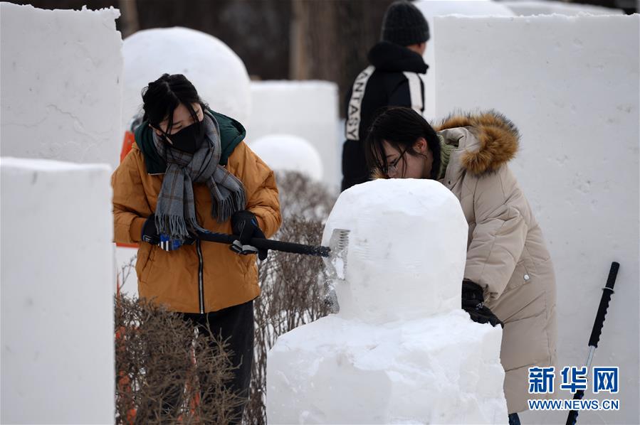 12月17日,雪雕師在松花江畔制作雪雕景觀。新華社記者王凱攝