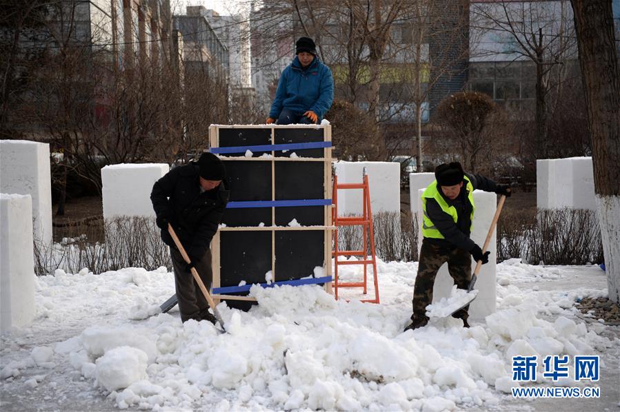 12月17日,工人們在松花江畔收集雪塊,準(zhǔn)備制作雪雕作品。新華社記者王凱攝