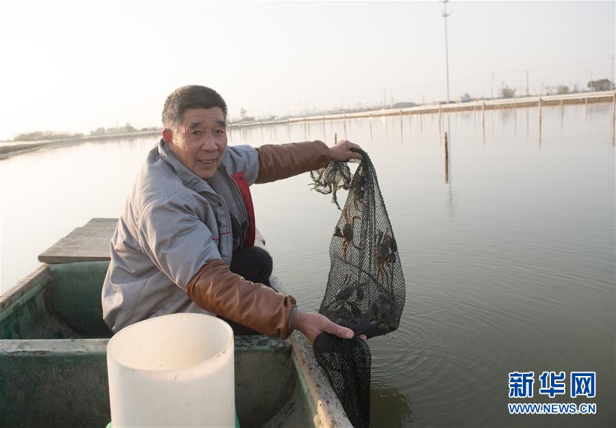 12月17日,在湖州市吳興區(qū)高新區(qū)廟港人千畝水產(chǎn)園,蟹農(nóng)在捕收大閘蟹。 新華社記者翁忻旸攝