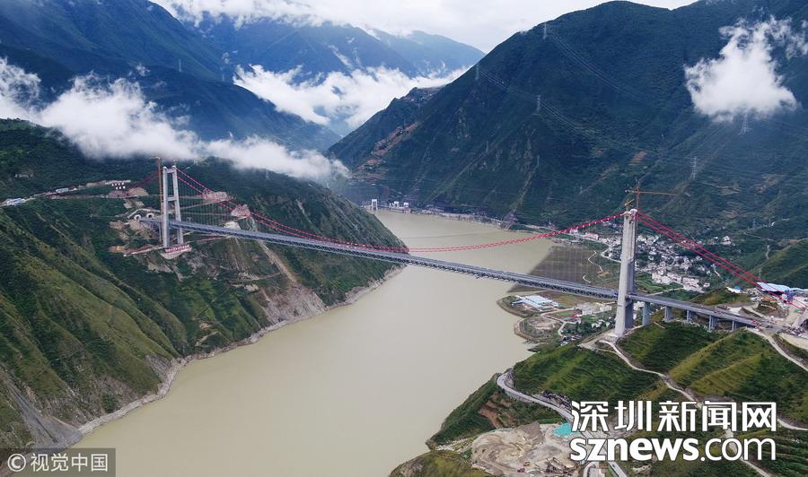 大橋擁有2個(gè)“第一”:主跨1100米,成為川藏在建第一大跨徑鋼桁梁懸索橋;雅安岸隧道式錨碇長159米,更是成為世界上在建第一長。