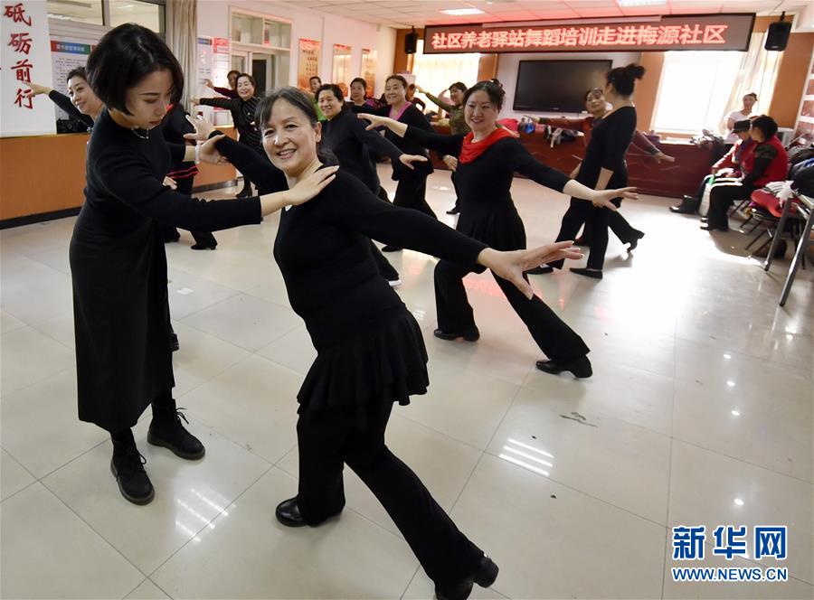 12月17日,豐臺區(qū)東高地街道日間照料中心的舞蹈老師在梅源社區(qū)組織老年人開展舞蹈訓練。 新華社記者 李欣 攝
