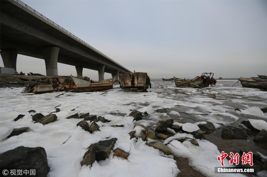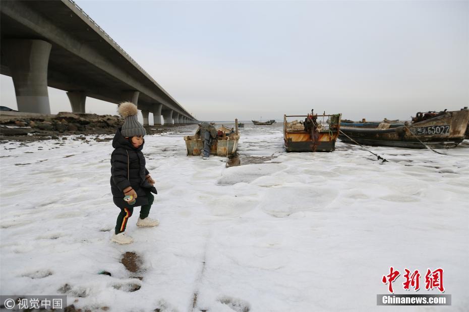 12月9日,受大風(fēng)降溫天氣影響,青島膠州灣北部冰情初現(xiàn),青島西海岸新區(qū)膠州灣跨海大橋入口處海冰層層疊疊,暫未對(duì)海上漁業(yè)生產(chǎn)帶來(lái)影響。張進(jìn)剛 攝 圖片來(lái)源:視覺中國(guó)