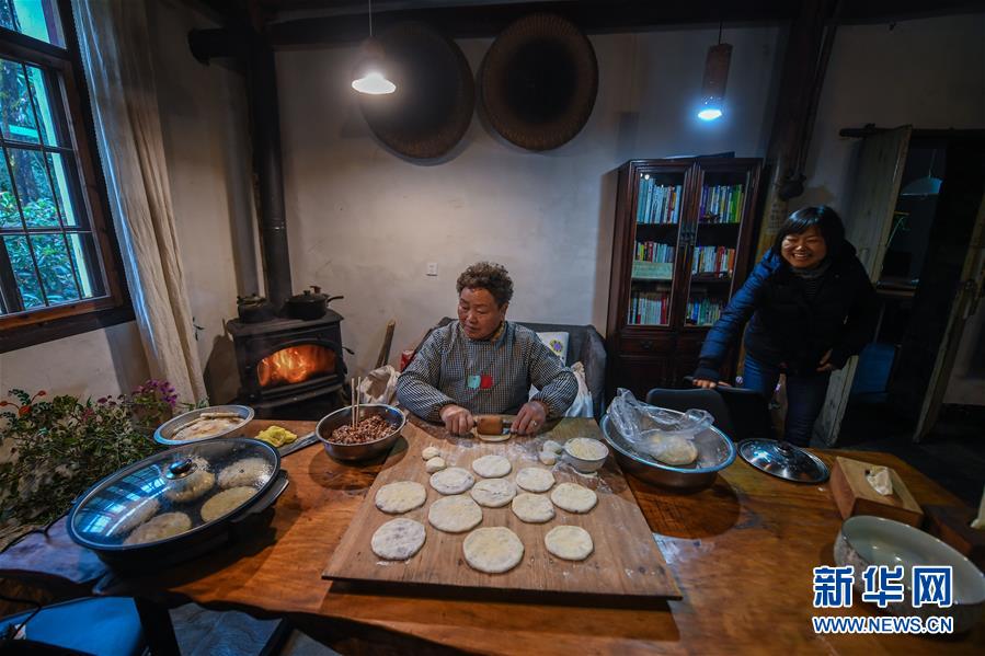 12月19日,民宿“僻地寒樓”的主人張雁(右)和媽媽在制作特色美食。該民宿共有7幢風格各異的小屋分布在山坡上,頗具特色。河橋鎮(zhèn)青年張雁辭去了上海的工作,回到家鄉(xiāng)開辦了這家民宿。 新華社記者 徐昱 攝