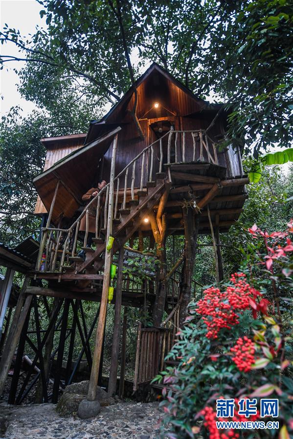 這是民宿“僻地寒樓”的一間樹屋(12月19日攝)。該民宿共有7幢風格各異的小屋分布在山坡上,頗具特色。河橋鎮(zhèn)青年張雁辭去了上海的工作,回到家鄉(xiāng)開辦了這家民宿。 新華社記者 徐昱 攝