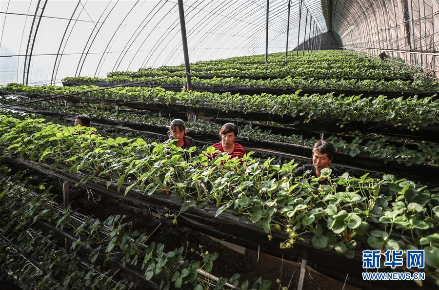 12月19日,農(nóng)戶在大棚里管理草莓。 2017年5月,遼寧省鐵嶺市昌圖縣大四家子鎮(zhèn)方家船口村利用土地確權(quán)成果,由村兩委班子成員領(lǐng)辦創(chuàng)辦了昌圖久晟果木蔬菜種植專業(yè)合作社。到2018年9月,合作社利用產(chǎn)業(yè)扶貧資金、壯大村集體經(jīng)濟(jì)扶持資金、村集體用地和村民入股資金建成了11個(gè)“股份制大棚”,主要種植草莓等作物,產(chǎn)品通過電商銷往云南、四川、北京、上海等地,預(yù)計(jì)第一期可為265名貧困戶每人分紅860元。 新華社記者潘昱龍攝
