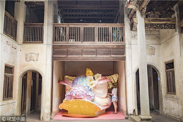 2018年8月10日,廣東揭陽,溫秋雯把獅子頭扒得只剩下骨架和包布,之后將不同顏色的紙片裁剪成三角形、鱗片形等不同形狀,作為裝飾獅子的皮毛,粘在獅子身上,獅子的鼻子則是用彩紙條以手鞠的方式纏繞而成,在獅頭內(nèi)部安裝了一盞白熾燈,一打開電燈,萌態(tài)可掬的獅子便呈現(xiàn)在人們眼前。紙片的顏色以淡粉、淡綠、淺白色為主,就這樣,人們平時(shí)印象中威猛的南獅,被改裝得萌萌的。圖為2018年8月10日,廣東省梅州市,溫秋雯和她的紙雕作品。