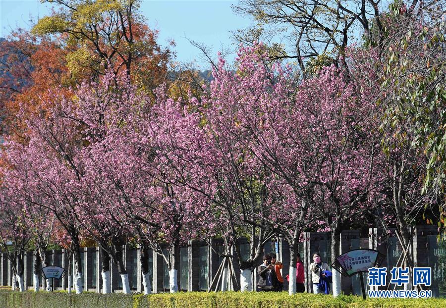 12月21日,游客在昆明市西山區(qū)一人行道上觀賞盛開(kāi)的櫻花。新華社記者楊宗友攝