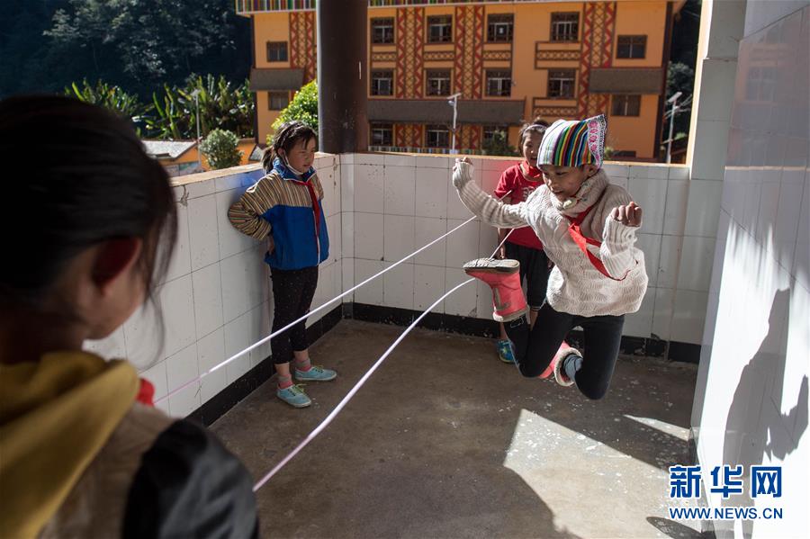 在獨(dú)龍江鄉(xiāng)中心小學(xué),孩子們在跳皮筋(2016年11月23日攝)。 新華社記者 胡超 攝