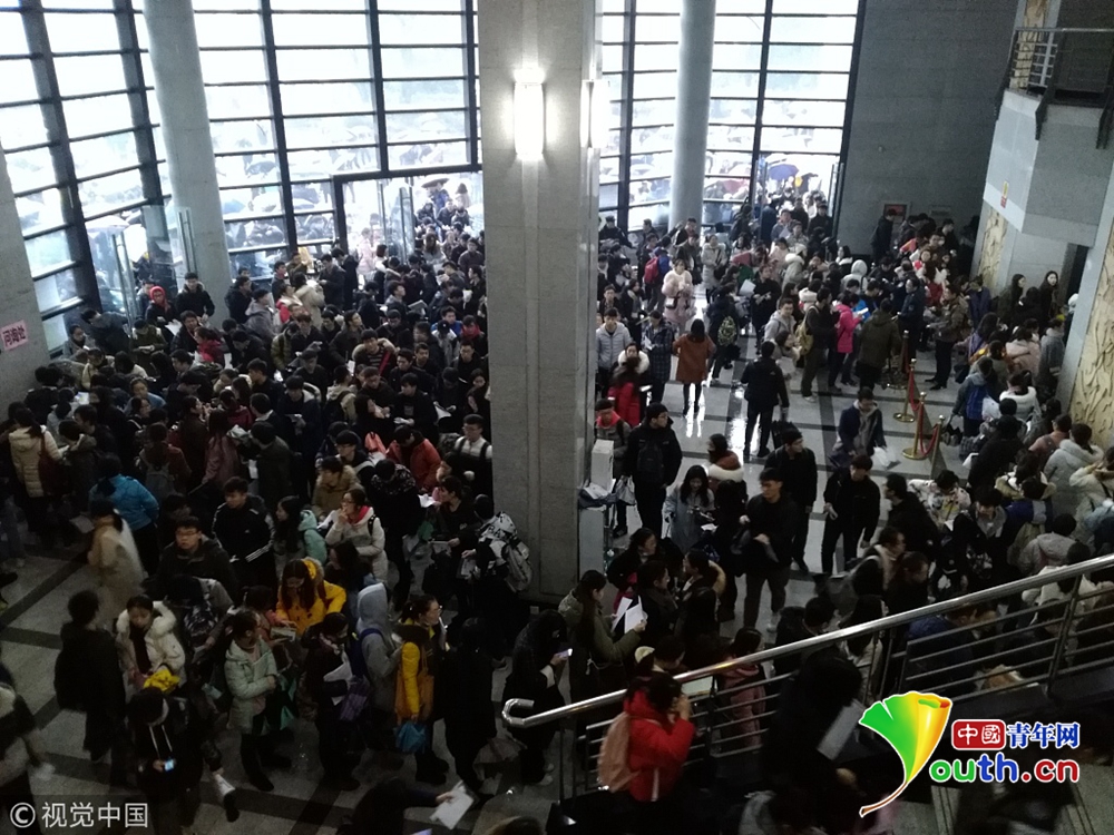 2018年12月22日,南京,在南京林業(yè)大學(xué)考點(diǎn),考生在雨中復(fù)習(xí),看考場分布圖,候考和進(jìn)場。