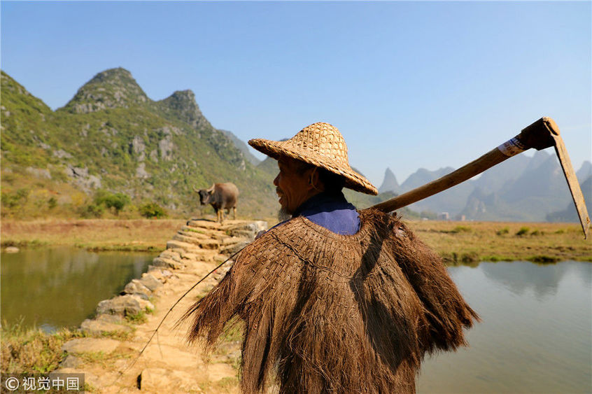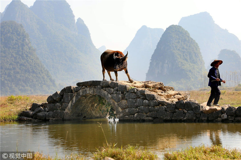 12月17日,在廣西桂林的臨桂區(qū)田心村這座叫做狀元橋的小橋上,剛吃過午飯,老許和他的水牛搭檔又要開始一場生態(tài)演出了。
