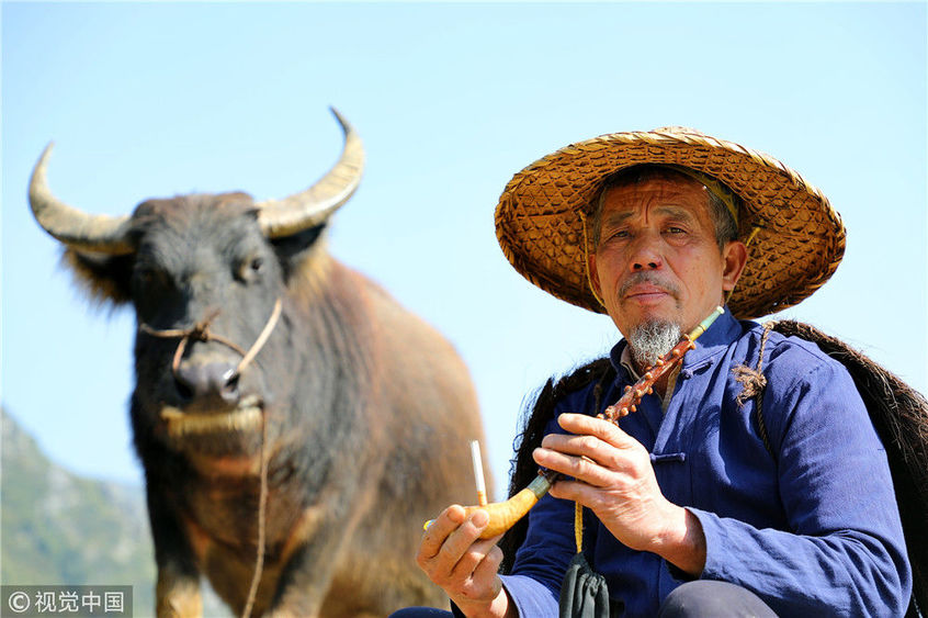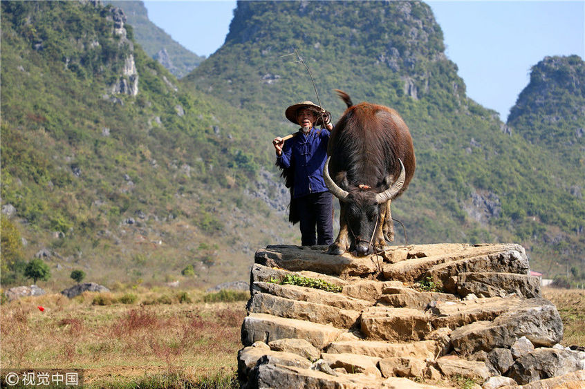 2018年12月17日,廣西桂林。用不到3年時間,農民許修保愣是將自己家的水牛訓練得走上了貓步,這讓來自全國各地的游客嘖嘖稱奇:你這么牛,維密天使情何以堪?憑著與水牛的聯(lián)袂演出,一個月下來,老許會有兩三萬的收入進賬,佩服得左鄰右舍紛紛向他伸出了大拇指。棋簿紫/視覺中國