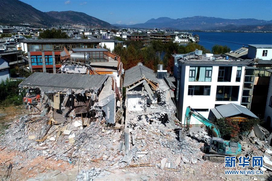 為實施“三線”劃定,喜洲鎮(zhèn)兩家民宿被拆除(11月15日無人機拍攝)。