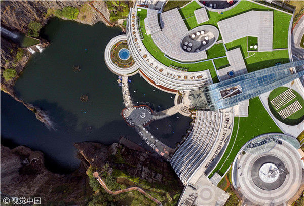 另外,大堂內(nèi)有一根動態(tài)水幕,自下而上直通屋頂,水幕是根據(jù)深坑的景色變化、巖層變化而安排的設(shè)計(jì)故事體驗(yàn)。