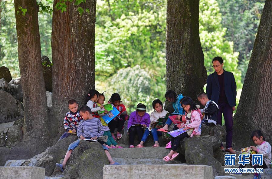 烏英教學(xué)點(diǎn)的孩子們?cè)诖髽湎聦W(xué)習(xí)(4月17日攝)。