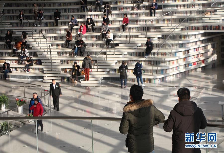 12月27日,讀者參觀天津?yàn)I海新區(qū)圖書館中庭。 濱海新區(qū)圖書館位于天津?yàn)I海文化中心,2017年10月1日正式開館,設(shè)計(jì)立意為“濱海之眼”和“書山有路勤為徑”。圖書館現(xiàn)有藏書60多萬冊(cè),一年多來接待讀者約280萬人次,已成為濱海新區(qū)的文化“新地標(biāo)”。 新華社記者段卓力攝