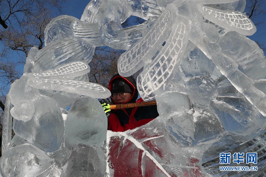 12月27日,選手在比賽中完善冰雕作品。 當日,第十六屆黑龍江省大學生冰雕藝術設計創(chuàng)作大賽在哈爾濱兆麟公園落下帷幕,全省高校共有99支隊伍參賽。 新華社記者曹霽陽攝
