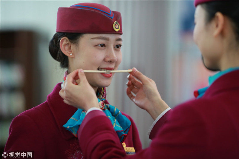 2018年12月27日,四川成都,為備戰(zhàn)即將開(kāi)通的成雅鐵路,中國(guó)鐵路成都局集團(tuán)有限公司成都客運(yùn)段動(dòng)車二隊(duì)對(duì)成雅動(dòng)車的乘務(wù)人員進(jìn)行理論、形體、服務(wù)禮儀等內(nèi)容的培訓(xùn)。