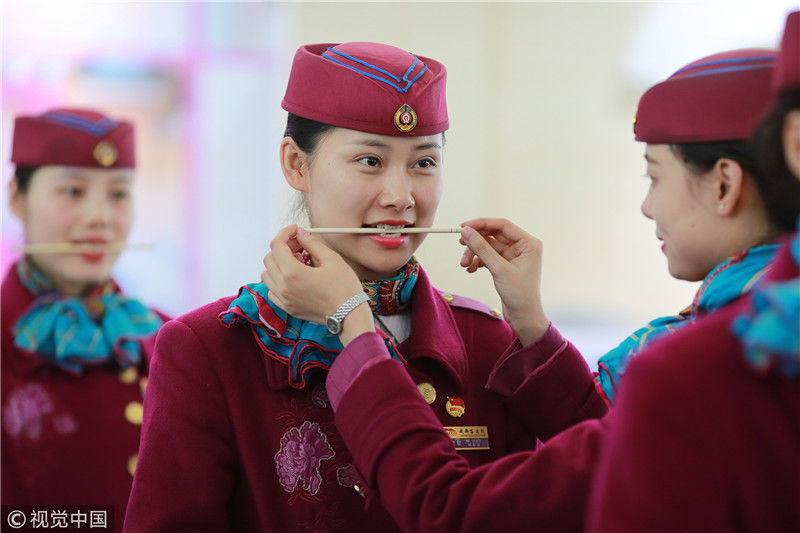 2018年12月27日,四川成都,為備戰(zhàn)即將開(kāi)通的成雅鐵路,中國(guó)鐵路成都局集團(tuán)有限公司成都客運(yùn)段動(dòng)車(chē)二隊(duì)對(duì)成雅動(dòng)車(chē)的乘務(wù)人員進(jìn)行理論、形體、服務(wù)禮儀等內(nèi)容的培訓(xùn)。