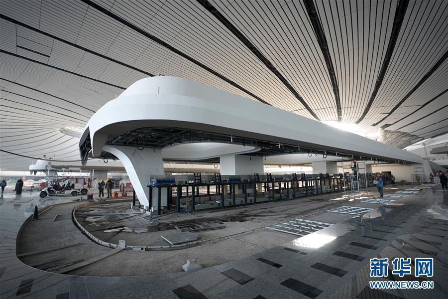 在北京大興國(guó)際機(jī)場(chǎng)主航站樓內(nèi),施工人員在進(jìn)行裝飾裝修工作。新華社記者 鞠煥宗 攝 圖片來(lái)源:新華網(wǎng)