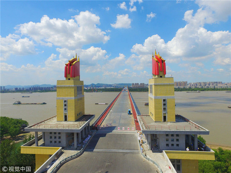 2018年6月24日,南京長江大橋修葺一新的米黃色橋頭堡,鮮艷的三面紅旗。