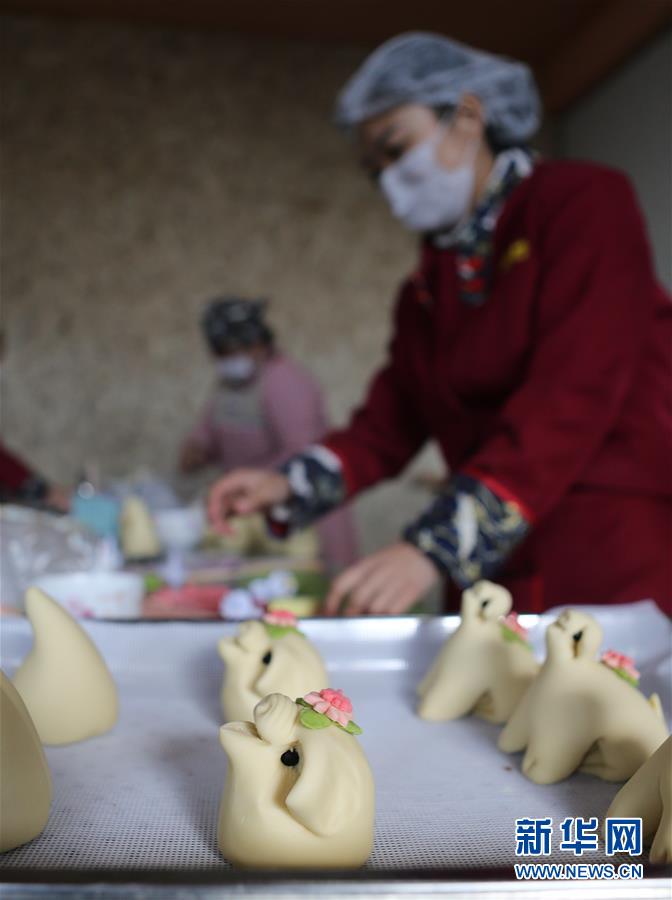 1月8日,工作人員準備將做好的花餑餑放入蒸箱。 新華社記者 李紫恒 攝