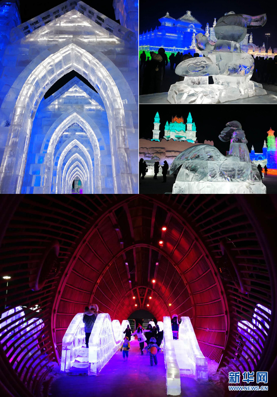 1月5日,游客們在哈爾濱冰雪大世界的各式冰建筑中游玩。 新華網(wǎng)記者 張明宇 攝