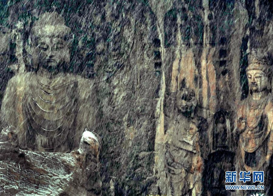 洛陽龍門石窟景區(qū)內(nèi)的盧舍那大佛在雪中若隱若現(xiàn)(1月9日攝)。 新華社記者李安攝