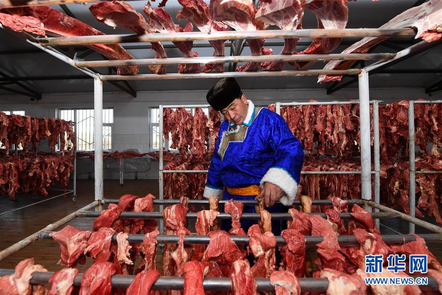 1月9日,牧民伊拉代在查看風(fēng)干牛肉。 新華社記者 劉磊 攝