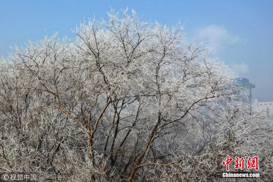 1月13日,霧散日升。河北省邢臺(tái)市大街小巷的樹枝上掛滿了潔白晶瑩的霜花,藍(lán)天下微風(fēng)吹拂銀絲閃爍,奇麗壯觀。給臘八節(jié)日增添了亮麗的風(fēng)景。霍紅軍 攝 圖片來源:視覺中國(guó)