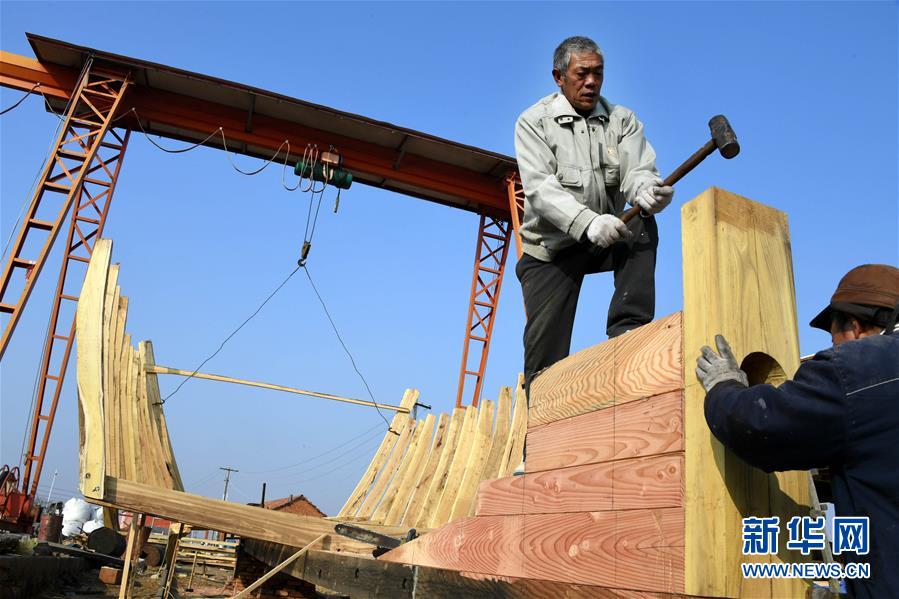在青島紅雙木造船廠,造船師傅掄起大錘,將粗大的螺絲釘打進(jìn)船體,固定船幫(1月10日攝)。新華社記者 李紫恒 攝