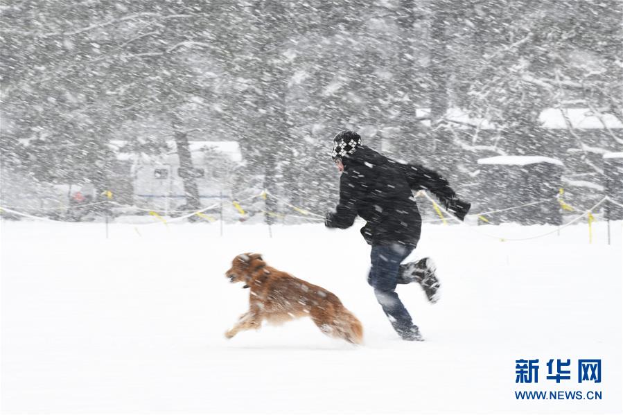 1月13日,在美國首都華盛頓,一名男子與寵物狗在林肯紀念堂旁玩耍。 近日,美國首都華盛頓及其周邊地區(qū)普降暴雪。降雪導(dǎo)致部分航班晚點或取消,道路交通事故增多。 新華社記者 劉杰 攝