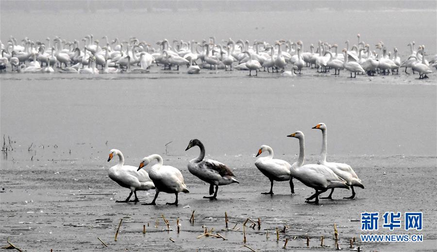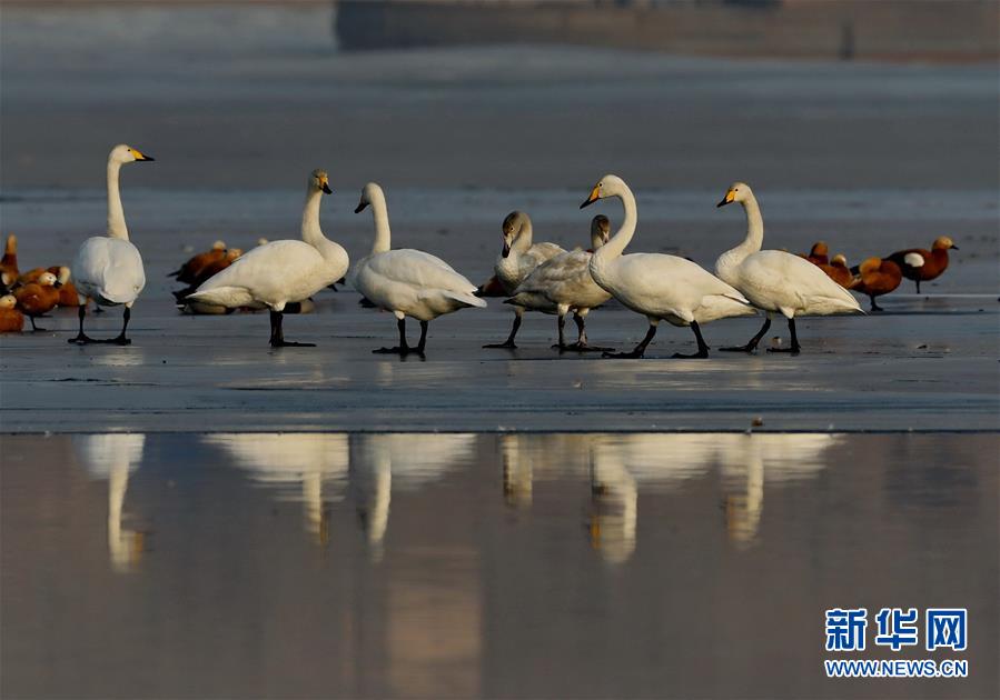 1月3日,白天鵝在三門峽黃河濕地棲息。 新華社記者王丁攝