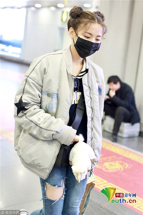 2019年1月14日,北京,楊超越現(xiàn)身機場。她扎哪吒頭活力十足,甩玩偶淘氣回眸,穿破洞褲露美腿,披面包服似自帶鼓風(fēng)機。