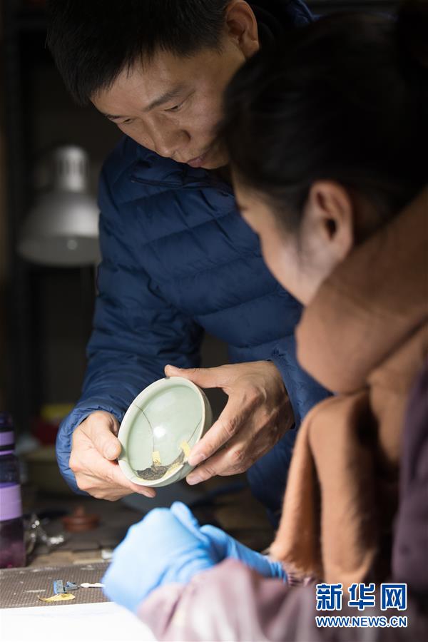 1月15日,龍泉青瓷藝術(shù)家楊盛侃(右)將一件有瑕疵的作品帶到吳榮強(qiáng)的工作室,跟他討論漆繕修復(fù)的細(xì)節(jié)。 新華社記者翁忻旸攝