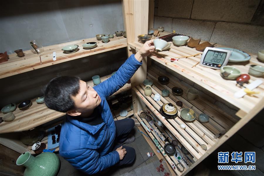 1月15日,吳榮強在龍泉市牛頭嶺村“七分醉”工作室蔭房內(nèi)查看干燥中的漆繕器皿。新華社記者翁忻旸攝